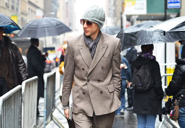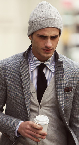 Poniżej kilka przykładów pokazujących, że czapka dzianinowa, która jest wykonana z dobrej jakości wełny, z ciekawym splotem i bez żadnych kolorowych akcentów, może pasować nawet do garnituru.