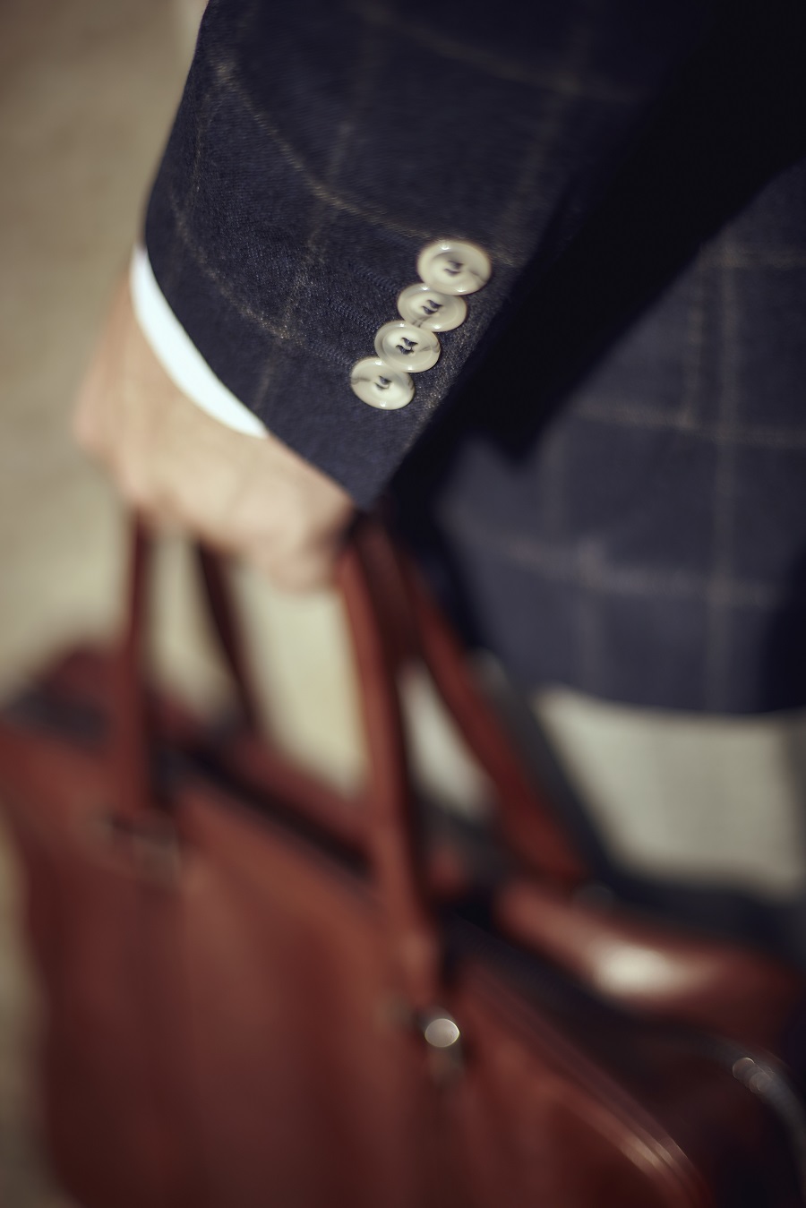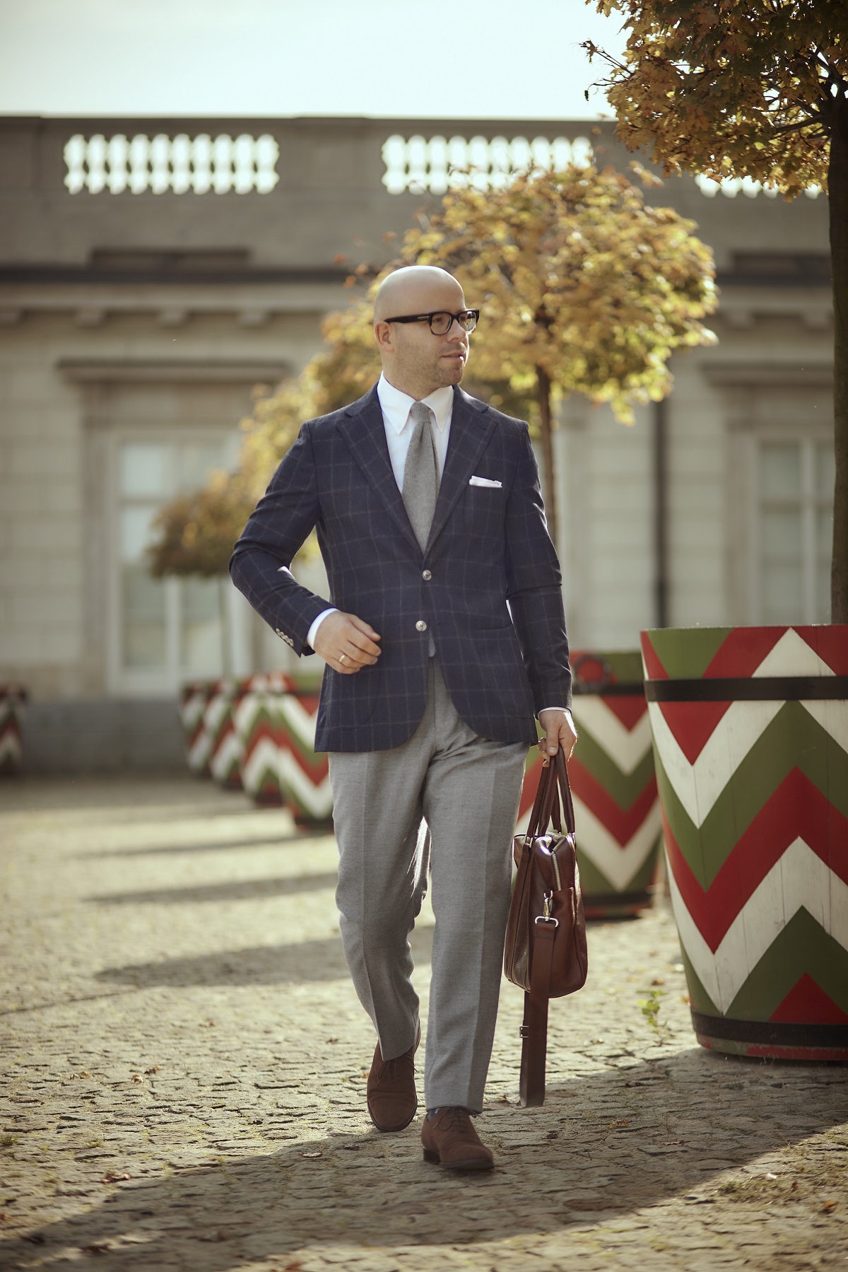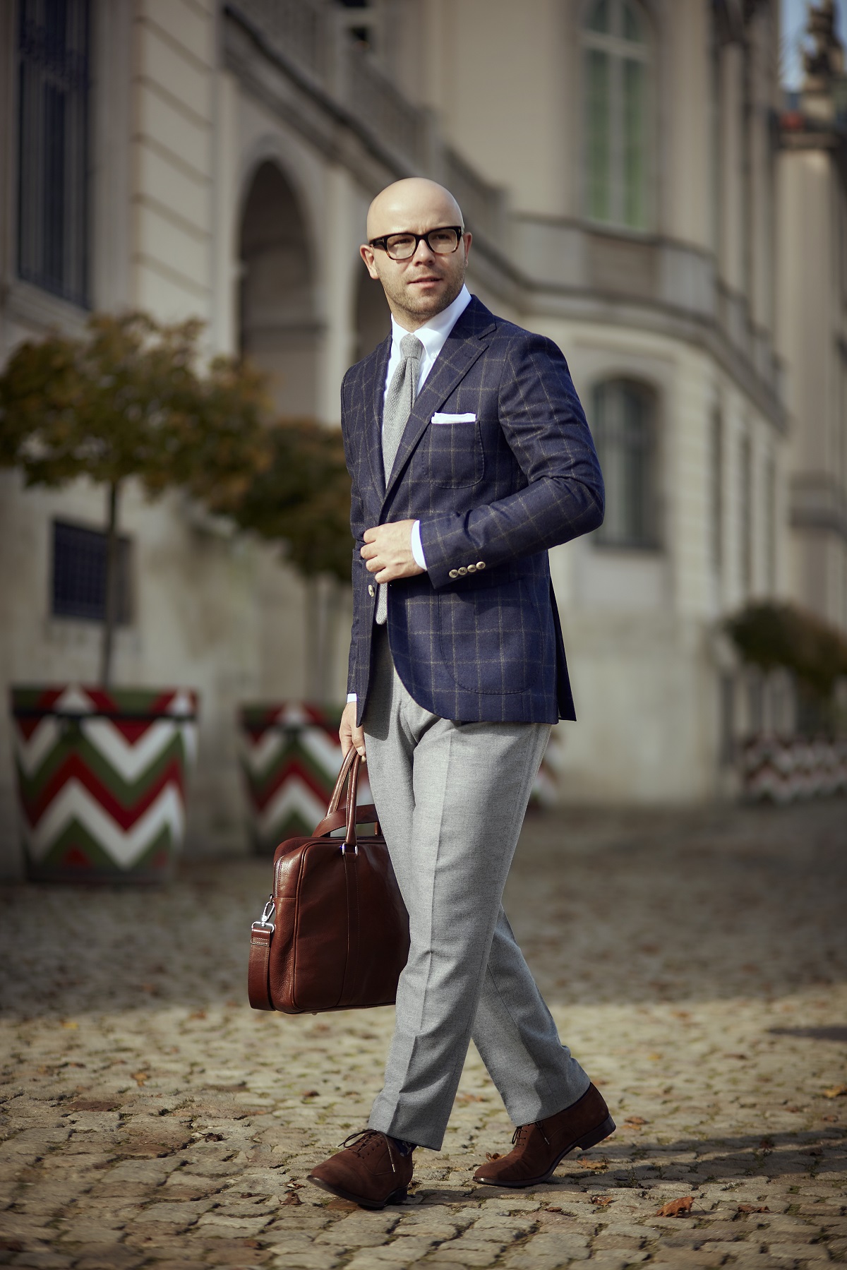 Jako potwierdzenie dominacji Włochów w branży tekstylnej weźmy teraz zestawy ubrań z dzisiejszej sesji. Z włoskich tkanin uszyte są: marynarka (Vitale Barberis Canonico), koszula (Tessitura Monti), szare spodnie (Loro Piana), kamizelka (Vitale Barberis Canonico). Krawat również wyprodukowano we Włoszech. A co z dodatkami skórzanymi? Jedna i druga torba uszyta jest z włoskiej skóry garbowanej roślinnie, co także potwierdza, że w przemyśle garbarskim Włosi są mocnym graczem.