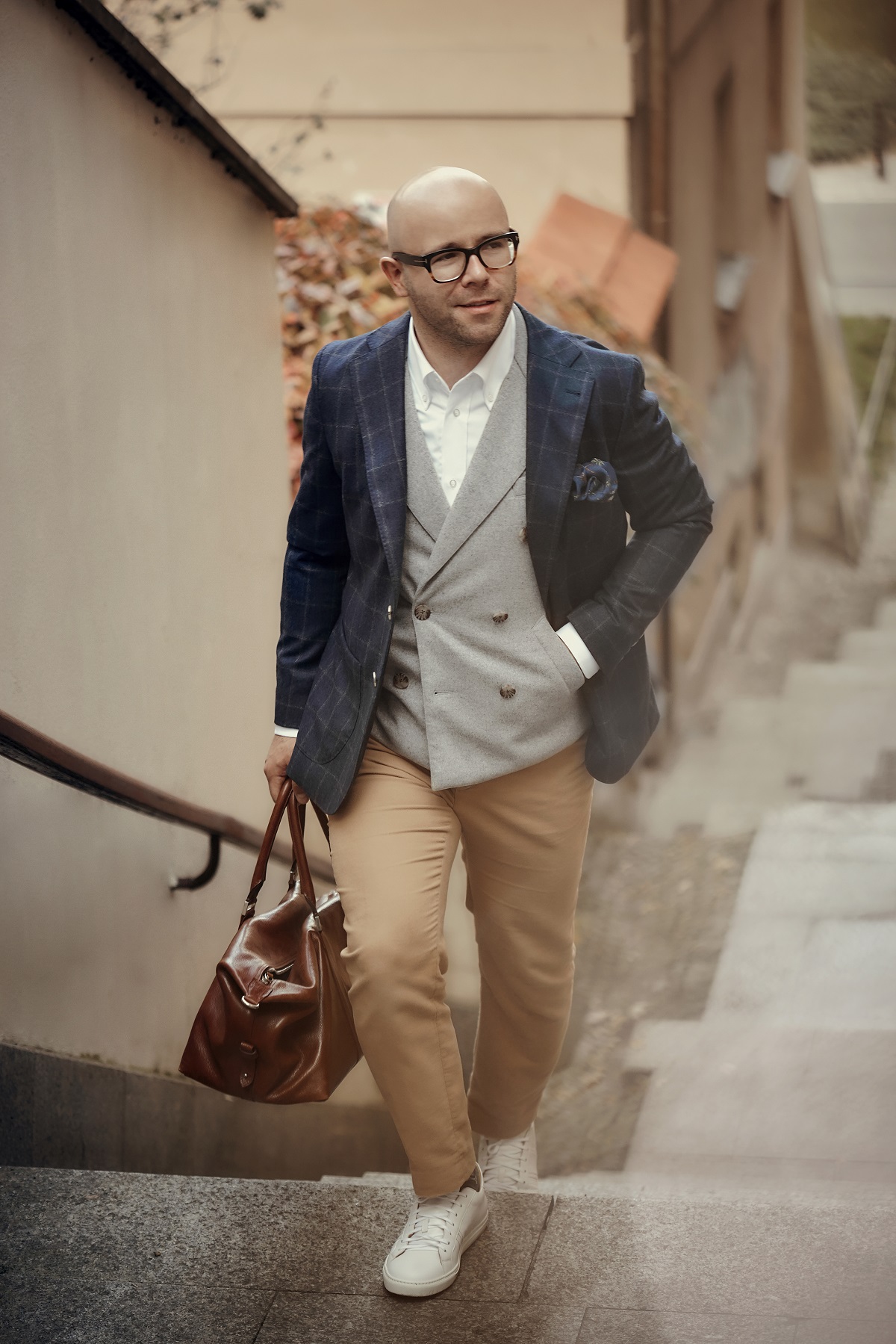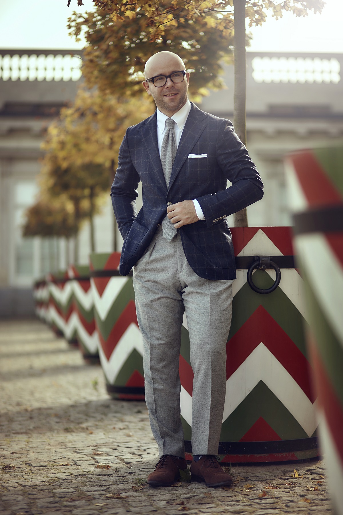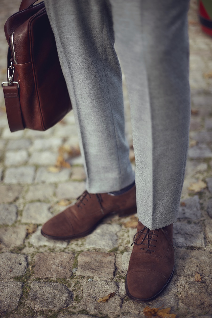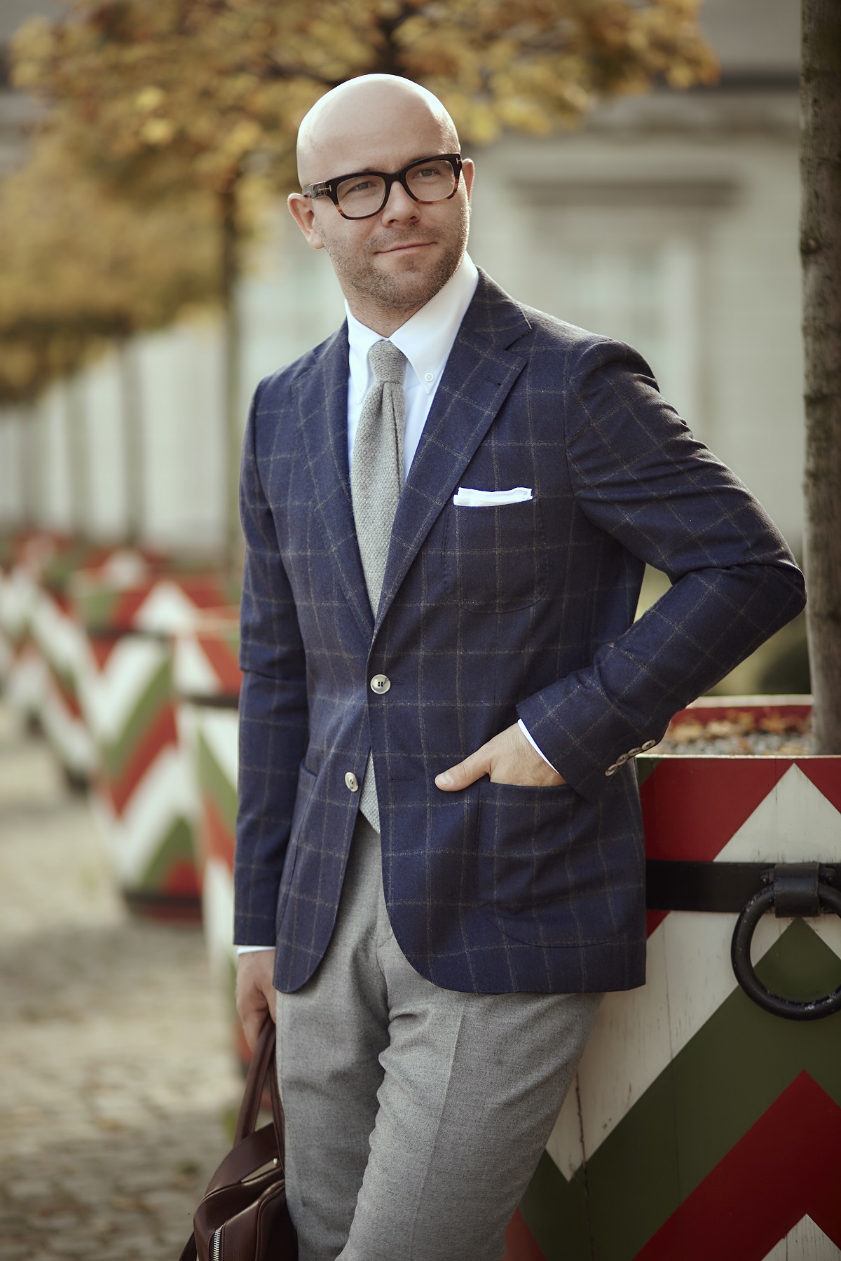Jako potwierdzenie dominacji Włochów w branży tekstylnej weźmy teraz zestawy ubrań z dzisiejszej sesji. Z włoskich tkanin uszyte są: marynarka (Vitale Barberis Canonico), koszula (Tessitura Monti), szare spodnie (Loro Piana), kamizelka (Vitale Barberis Canonico). Krawat również wyprodukowano we Włoszech. A co z dodatkami skórzanymi? Jedna i druga torba uszyta jest z włoskiej skóry garbowanej roślinnie, co także potwierdza, że w przemyśle garbarskim Włosi są mocnym graczem.