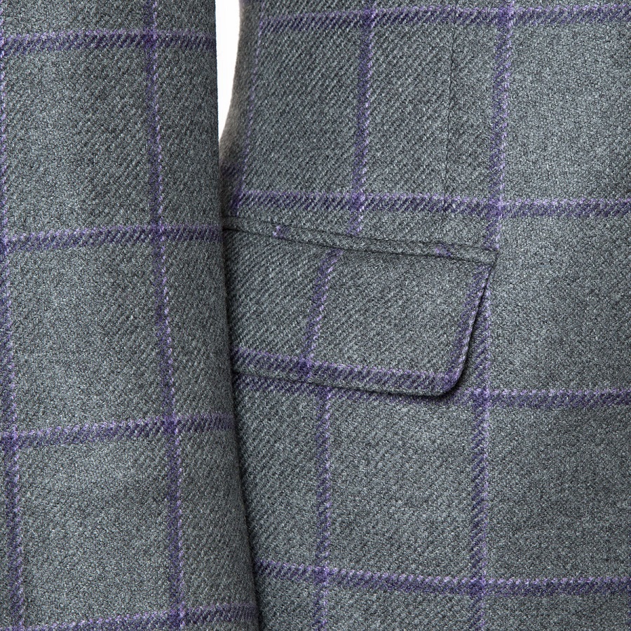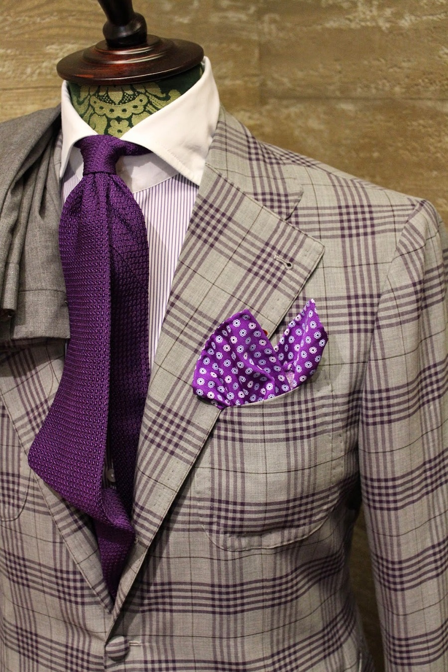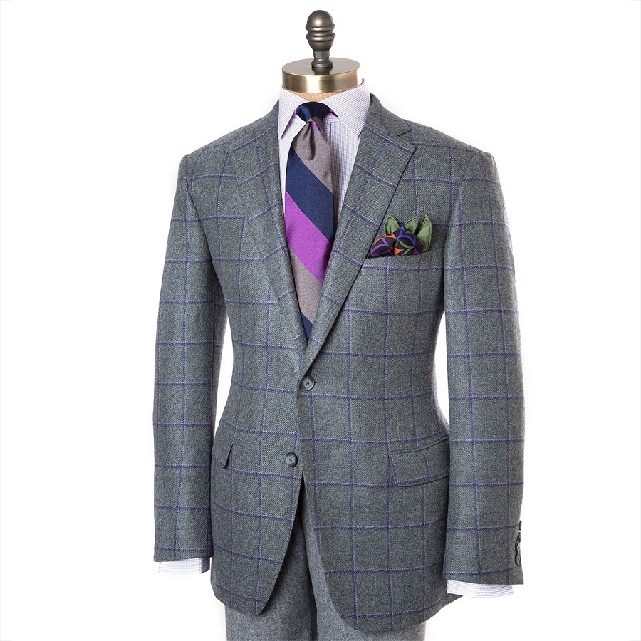Znacznie bezpieczniejszą opcją będzie wybór tkaniny, gdzie fiolet pojawia się tylko jako akcent np. na szarej kracie Księcia Walii albo przy wzorze windowpane. Taka marynarka/garnitur z daleka nadal pozostaje stonowana, ale już z bliska widać smaczek na tkaninie, więc może to być opcja dla osób, które muszą nosić garnitur, ale jednocześnie lubią w ubiorze przemycać swój styl i upodobania kolorystyczne.