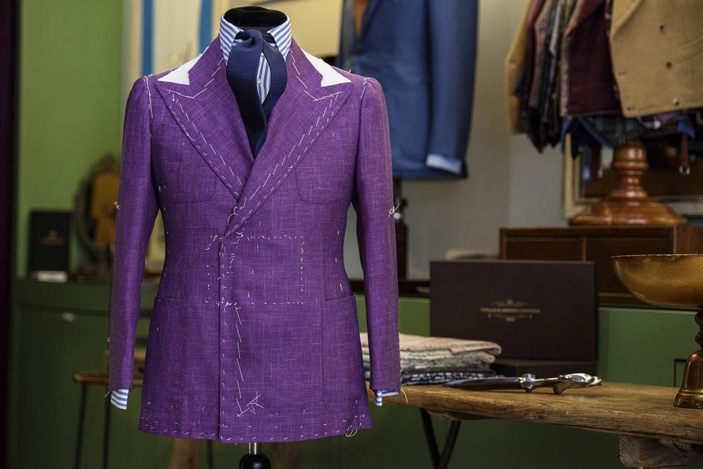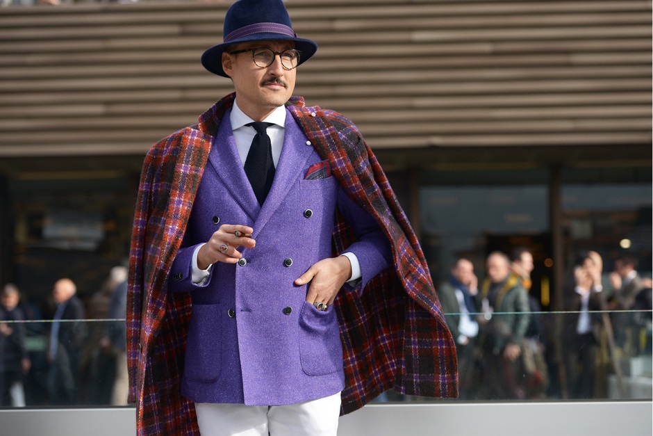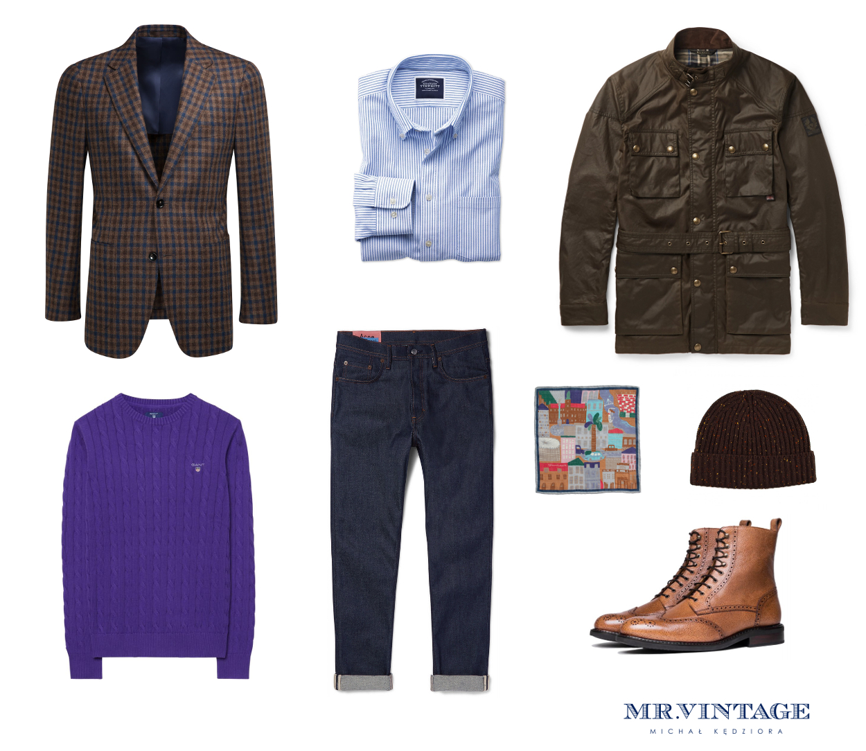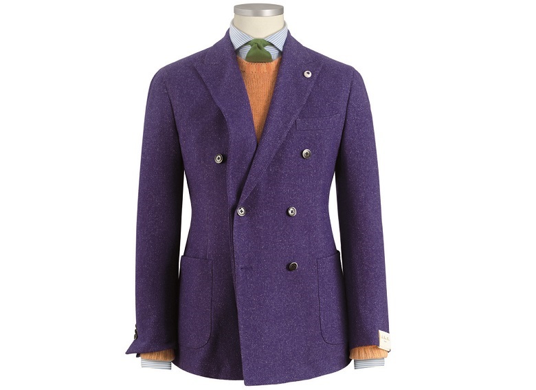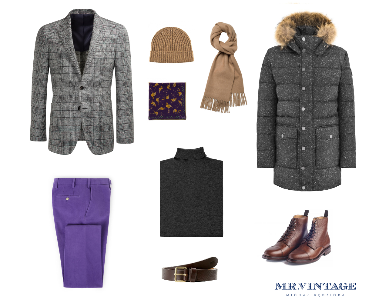 Przyznam szczerze, że hasło „fioletowa marynarka” kojarzy mi się bardziej z bakłażanowymi garniturami z lat 90 niż z czymś stylowym, ale gdy zacząłem przeszukiwać zasoby internetowe, to znalazłem kilka ciekawych marynarek w tym kolorze, którym daleko do tego synonimu kiczu. Oczywiście jest to propozycja dla osób, które lubią się wyróżniać strojem, a kluczem do sukcesu będzie wybór odpowiedniej tkaniny. By fiolet stracił swój „remizowy” charakter polecałbym tkaniny o włochatej, melanżowej fakturze, która skutecznie przygasza tak mocny odcień. Mam na myśli flanelę w mikrowzory (np. pepitka lub jodełka), a także klasyczny tweed.