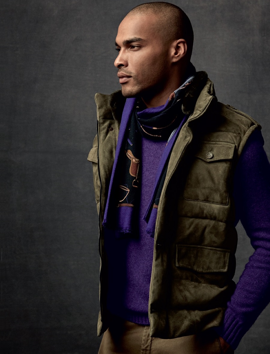 Marynarka Suitsupply, golf Lancerto, kurtka Ochnik, spodnie New and Lingwood, czapka Berg&Berg, szalik Suitsupply, poszetka Drake’s, pasek Closed, buty Berwick.
