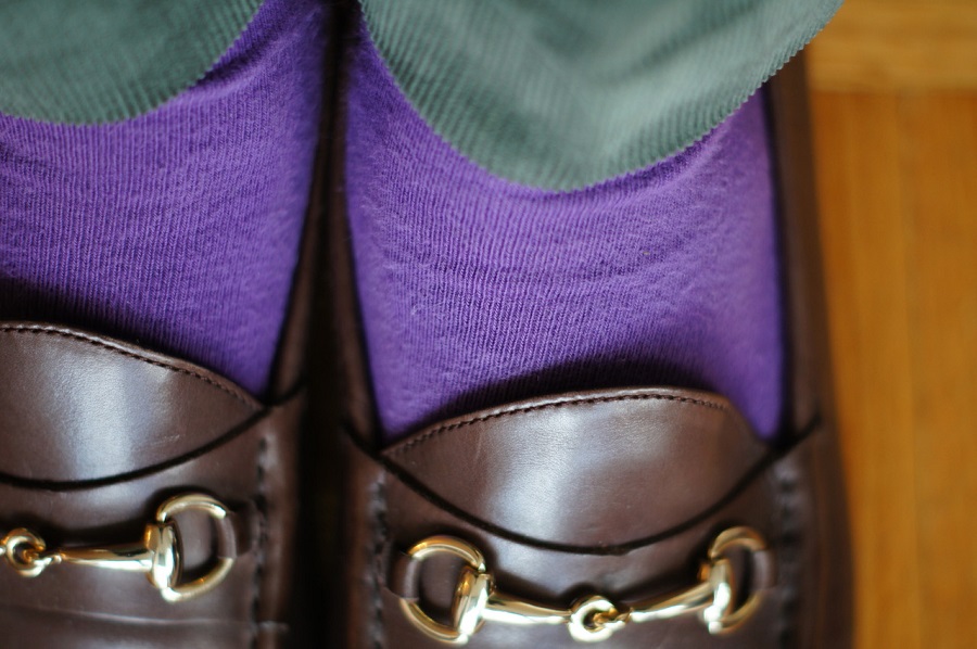 Jeśli nie macie jeszcze w szufladzie eleganckich skarpet w kolorze fioletowym, to postaram się was przekonać, bo chyba żaden inny kolor nie robi takiego wrażenia jeśli chodzi o tę część garderoby. I tutaj sytuacja jest podobna jak z krawatem – fioletowe skarpety nie są tak „grzeczne” jak granatowe, szare czy brązowe, ale też nie tak kontrastowe jak czerwone, pomarańczowe czy czerwone. Ze spodniami z szarej flaneli wyglądają pięknie, podobnie jak z beżowymi chinosami czy ciemnozielonymi sztruksami. Warto mieć choć jedną parę w szufladzie.