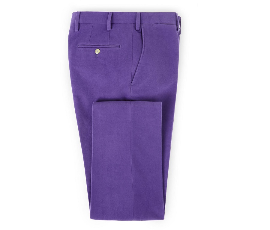 Wydaje się, że moda na kolorowe chinosy nieco przygasła w ostatnich sezonach (sam zresztą noszę je rzadziej niż kilka lat temu), ale nadal mają one wielu fanów. Z tego co wiem, to w Polsce numerem jeden jest czerwień jeśli chodzi o mocniejsze kolory spodni. Bohater dzisiejszego wpisu, czyli fiolet też może pięknie wyglądać jako nieformalne spodnie, w dodatku jest bardzo rzadko spotykany, więc jest świetną alternatywą dla sympatyków spodni czerwonych, zielonych czy pomarańczowych. Fiolet pięknie wygląda na tkaninach matowych, czyli w przypadku spodni casualowych będzie to sztruks, twill bawełniany, moleskin.