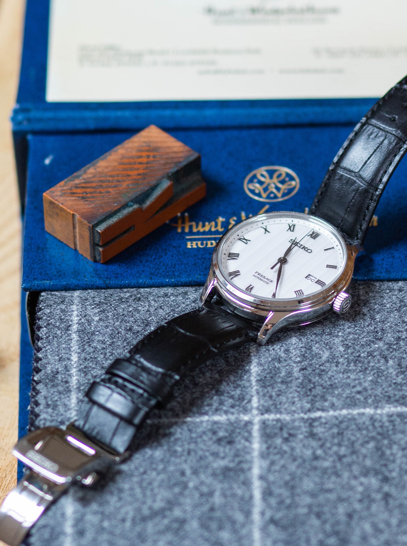 Na koniec zostawiłem Japończyka, czyli markę Seiko, która ma w swojej ofercie wiele ładnych klasyków w stylistyce retro i świetny stosunek ceny do jakości. Ja wybrałem model z popularnej linii Presage z białą tarczą i charakterystyczną fakturą jodełki.