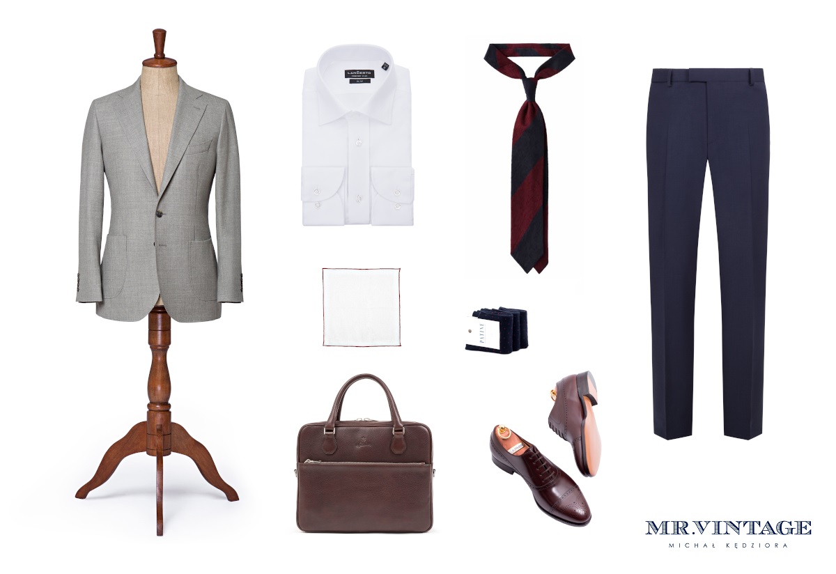 Marynarka Lancerto & Mr.Vintage, koszula Lancerto, krawat Viola Milano, spodnie Strellson, poszetka Zack Roman, skarpety Patine, torba Sartolane, buty TLB