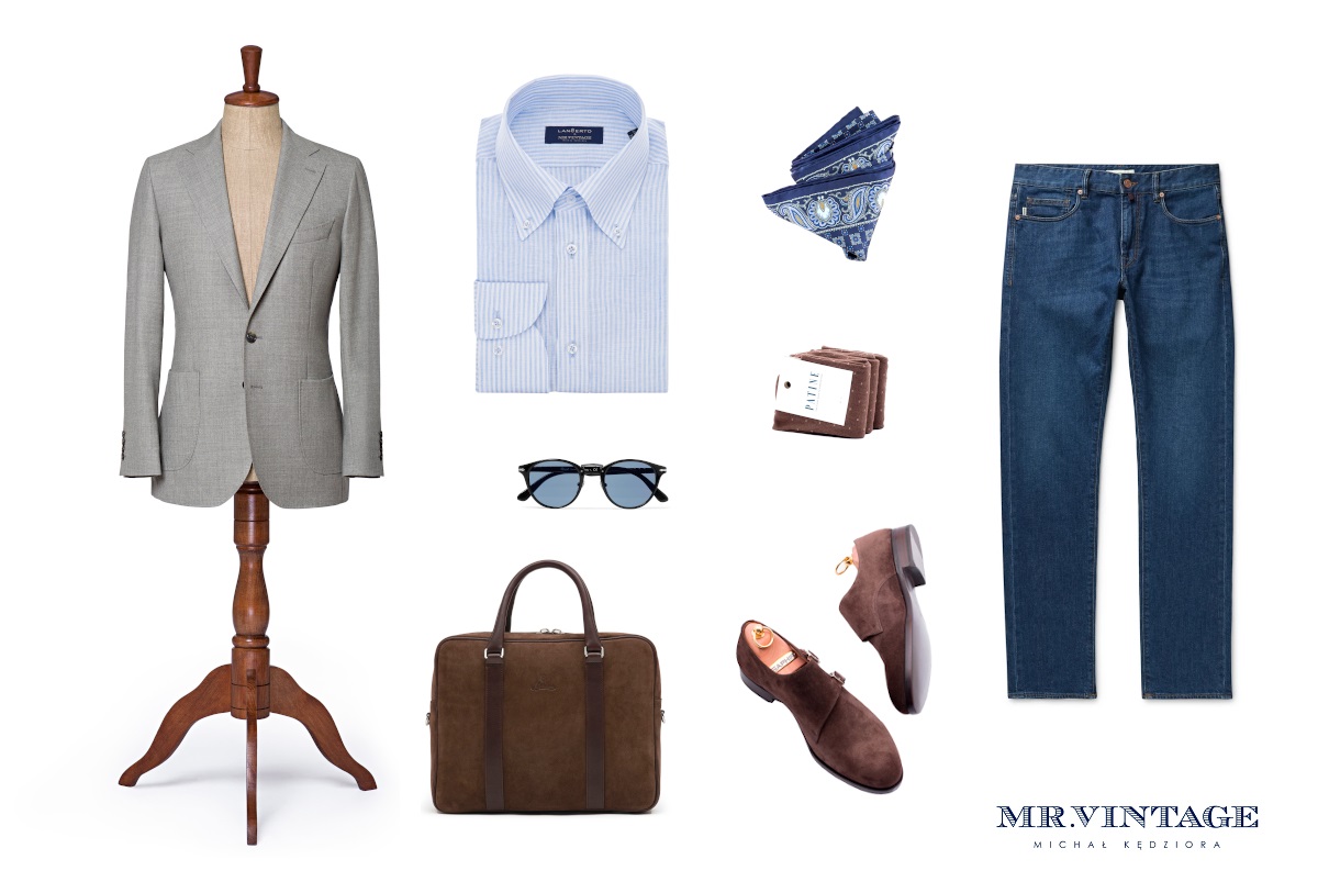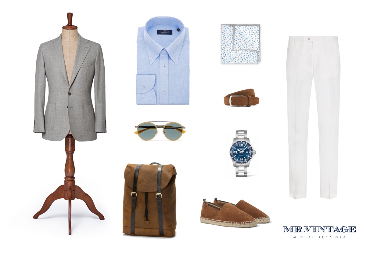 Marynarka Lancerto & Mr.Vintage, koszula Lancerto & Mr.Vinatge, poszetka Lancerto, spodnie Hiltl, okulary Persol, zegarek Longines, pasek Sartolane, plecak Herring Shoes, espadryle Castaner