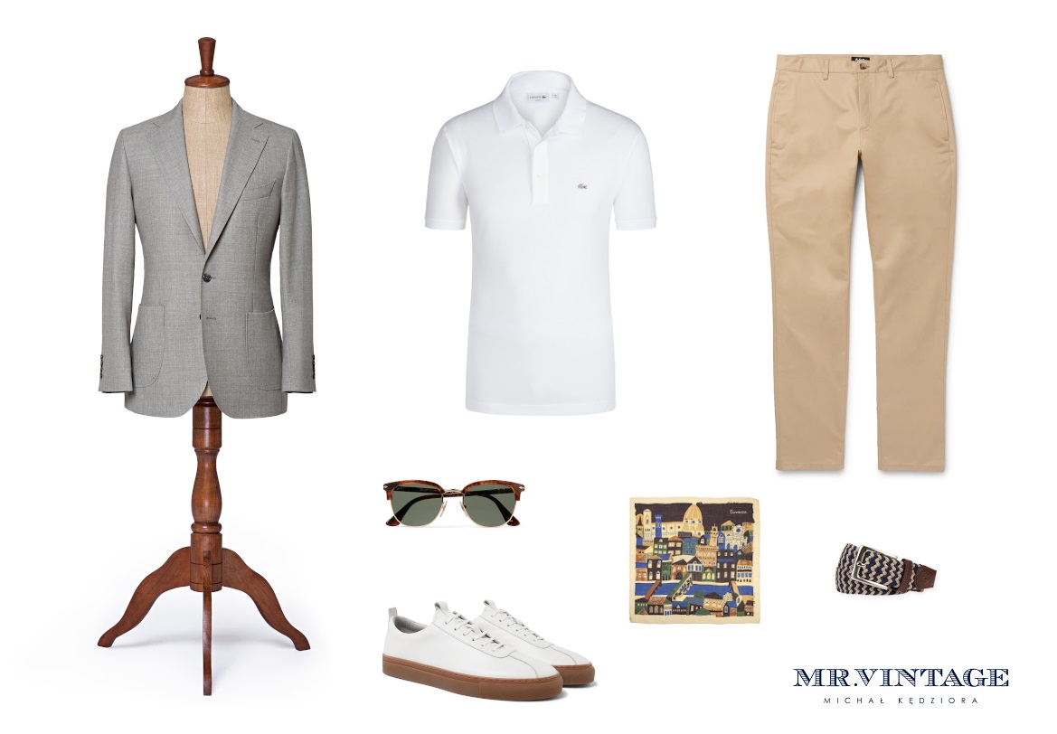 Marynarka Lancerto & Mr.Vintage, polo Lacoste, spodnie APC, okulary Persol, pasek Lancerto, poszetka Poszetka.com, buty Grenson