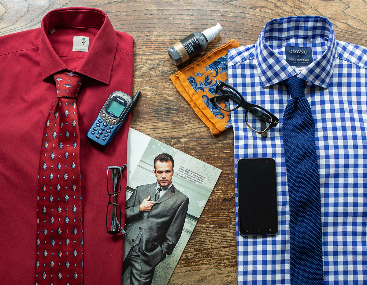Jak widać, w tym czasie wiele się zmieniło jeśli chodzi o fasony, szczególnie ubrań eleganckich. Przede wszystkim ubrania są bardziej dopasowane do ciała (węższe ramiona w marynarkach, podkreślona talia, dużo węższe nogawki, koszule krojone blisko ciała), zmieniły się też ich proporcje (krótsze marynarki, krótsze spodnie), a także detale (np. obecnie w zasadzie nie występują marynarki na trzy i cztery guziki, tak popularne w końcówce lat 90) i kolorystyka (współczesna moda męska nie jest tak monotonna). Na przełomie wieków popularne były także dziwne eksperymenty typu bordowe, seledynowe albo pomarańczowe koszule garniturowe. Jeśli pamiętacie jeszcze markę Sunset Suits (jeden z symboli rodzimej elegancji przełomu wieków), to ich wzornictwo bazowało właśnie na takich „perełkach”.