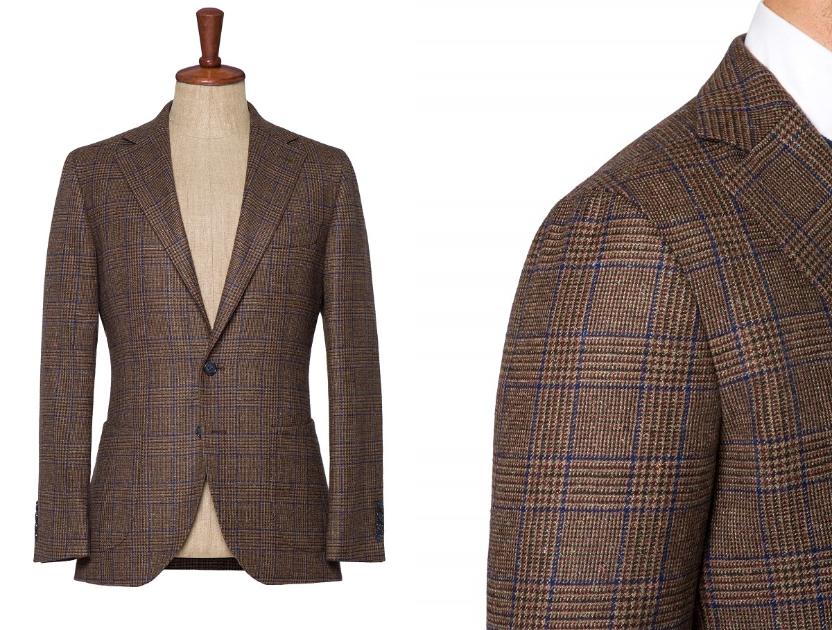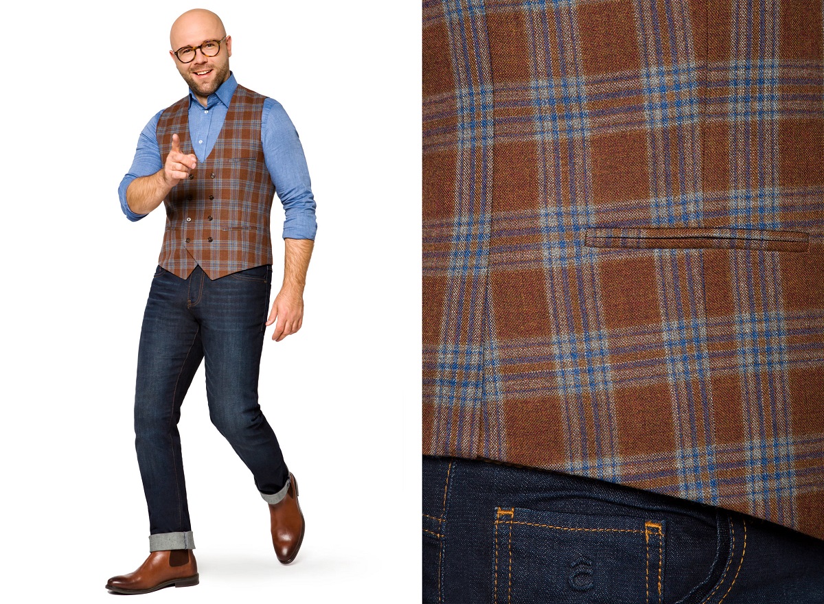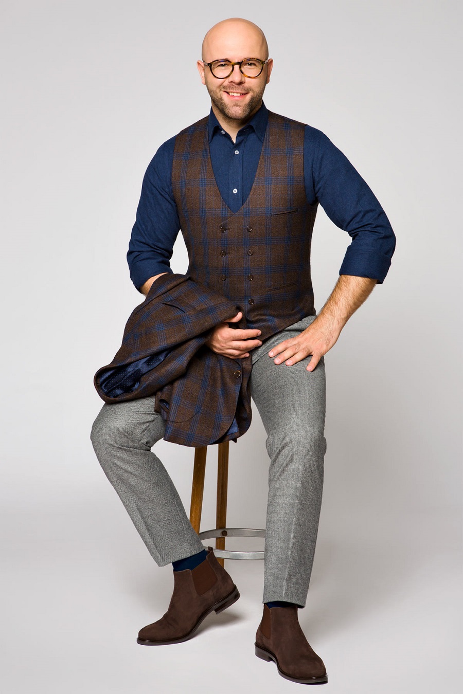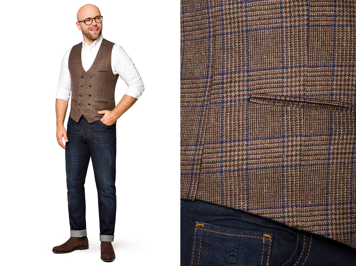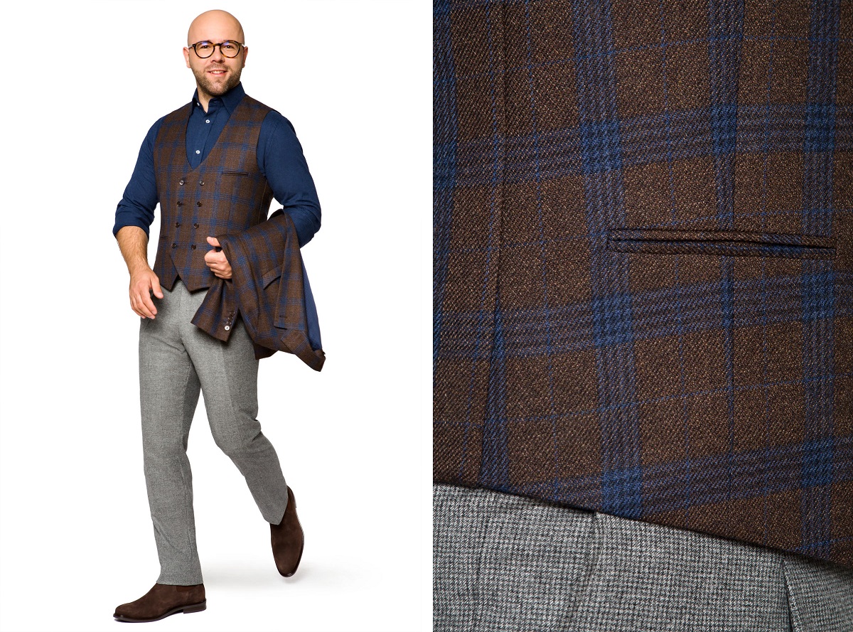 Krata księcia Walii wraca do naszych kolekcji regularnie, ale tym razem w wydaniu jakiego jeszcze nie było. Gdy kilka tygodni temu pokazywałem na Instagramie zajawki nowej kolekcji, to właśnie ta tkanina wzbudziła najwięcej reakcji i wcale się nie dziwię, bo rzeczywiście jest bardzo oldskulowa. Krata księcia Walii kojarzy się głównie z szarą tkaniną, a tu mamy brąz oraz raport w kolorze niebieskim. Dodatkowym smaczkiem tej tkaniny jest jej struktura w której można się dopatrzeć wielokolorowych „kropek”, które przypominają słynny donegal tweed. Świetna marynarka do dżinsów. Z tej samej tkaniny mamy także kamizelkę.