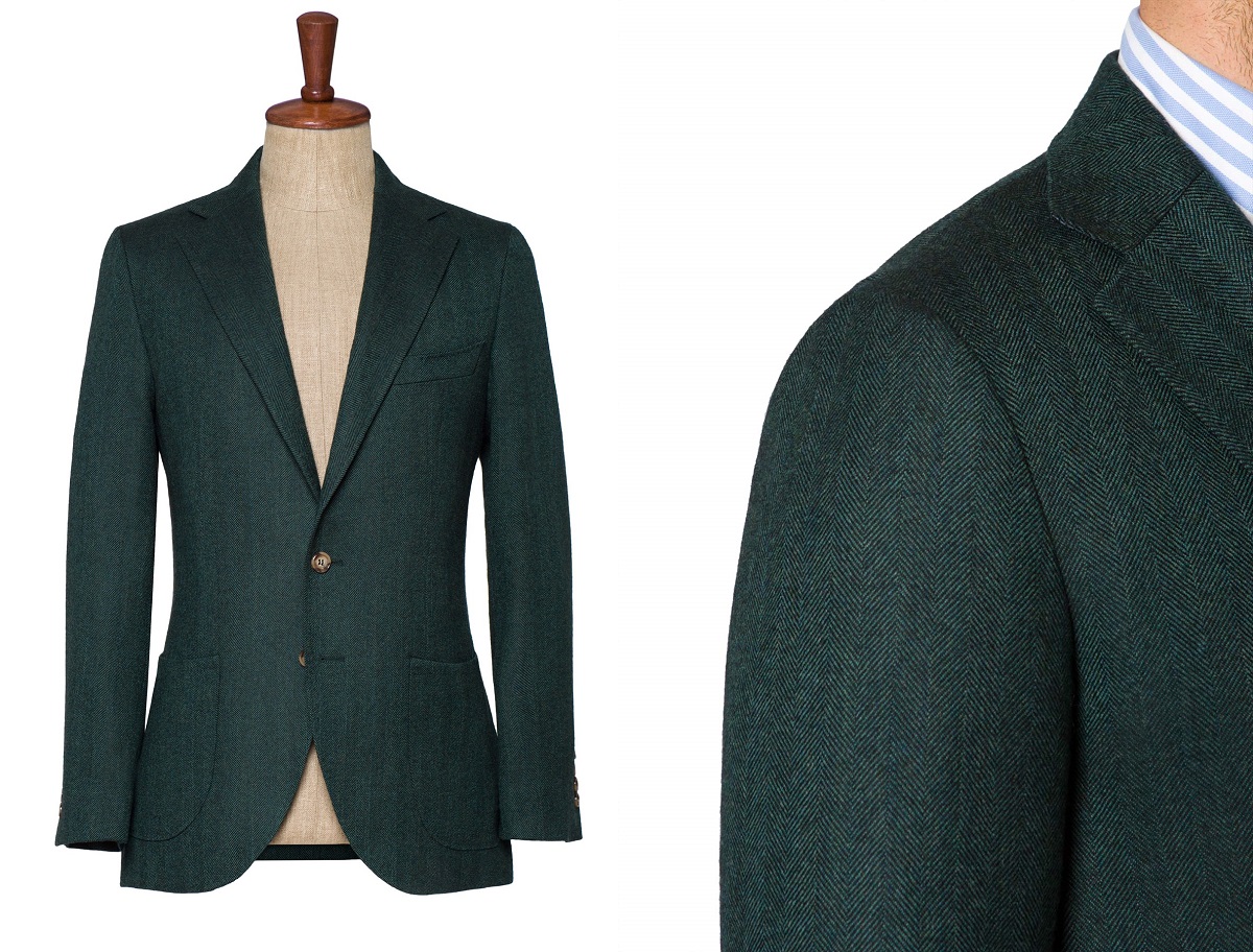 W naszych dotychczasowych kolekcjach mieliśmy już kilka marynarek w kolorze ciemnozielonym i każda z nich była bestsellerem, więc i tym razem udało mi się wybrać coś, co w mojej ocenie ma szansę powtórzyć ten sukces. To mięsista wełna o włochatej fakturze przypominającej tweed. Zresztą sam wzór – jodełka – również może się kojarzyć z tweedem. Na dużym zbliżeniu można zobaczyć, że tkanina utkana jest z przędzy zielonej i granatowej, no i właśnie w zestawach z granatem (spodnie, koszule, golfy) wygląda najlepiej. Polecam też zestawy z kamizelką z tej samej tkaniny.