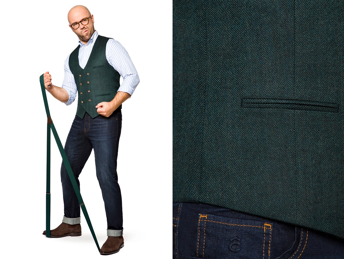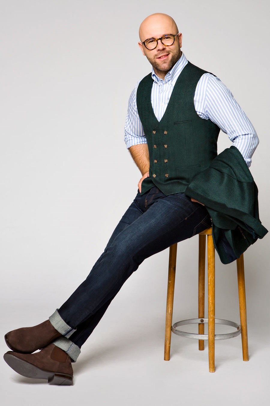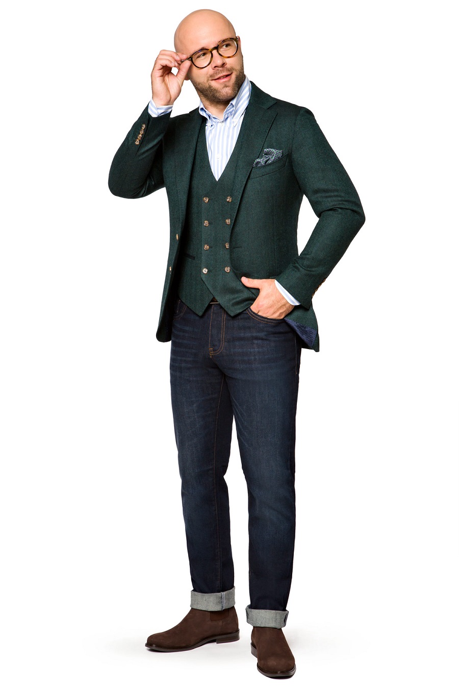 W tym sezonie mamy rekordową liczbę modeli z kamizelek, aż pięć. Tym razem zastosowaliśmy pomysł z ostatniej kolekcji wiosennej, czyli uszyliśmy kamizelki dokładnie z tych samych tkanin co marynarki, bo wielu klientów kupowało sobie „komplet”. Można polemizować czy w sezonie wiosenno-letnim ma to sens (dwa warstwy materiału), ale w sezonie jesienno-zimowym wygląda to naprawdę fajnie, jeśli ktoś lubią taką warstwowość. Zobaczcie moją stylizację z zieloną marynarką i kamizelką.