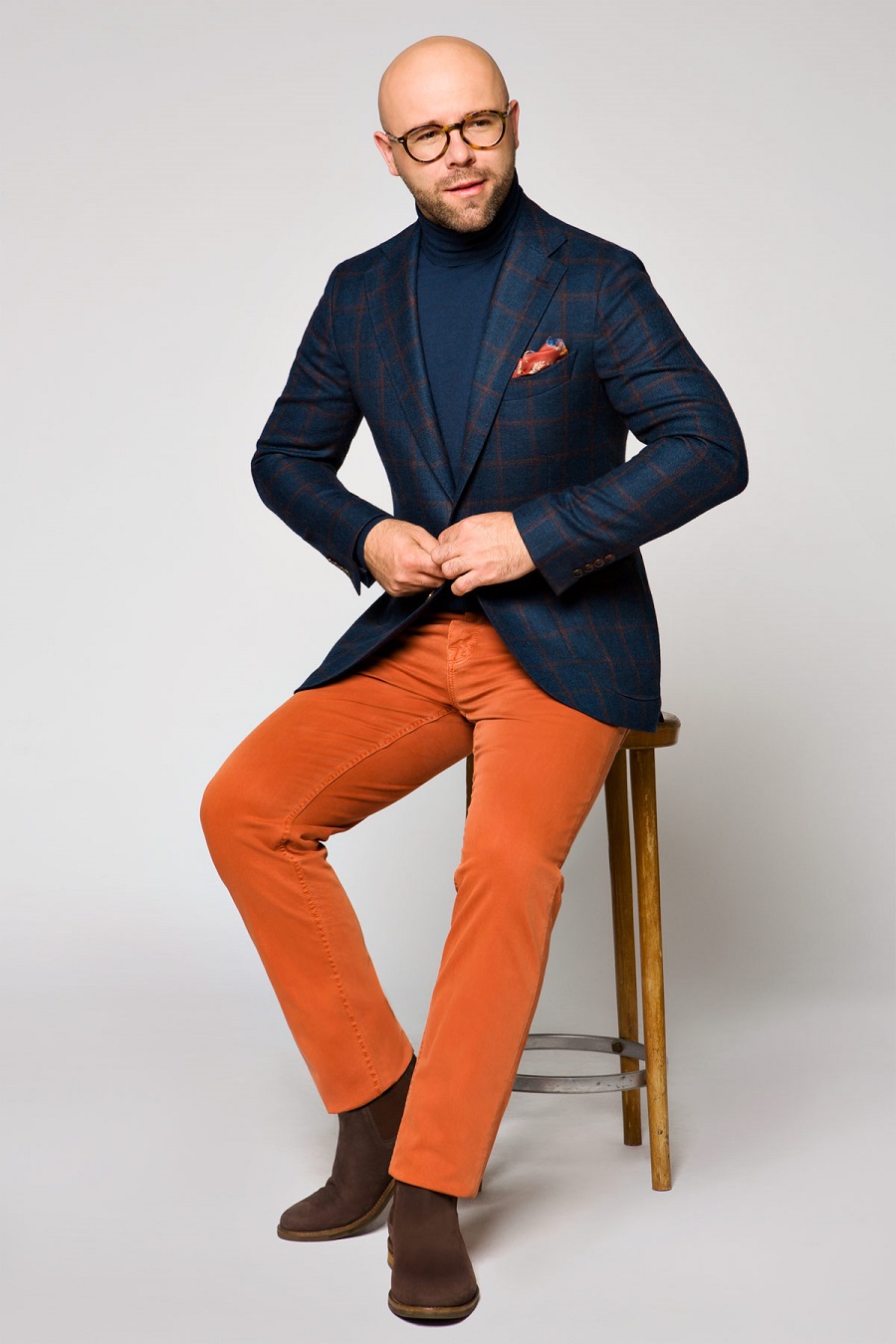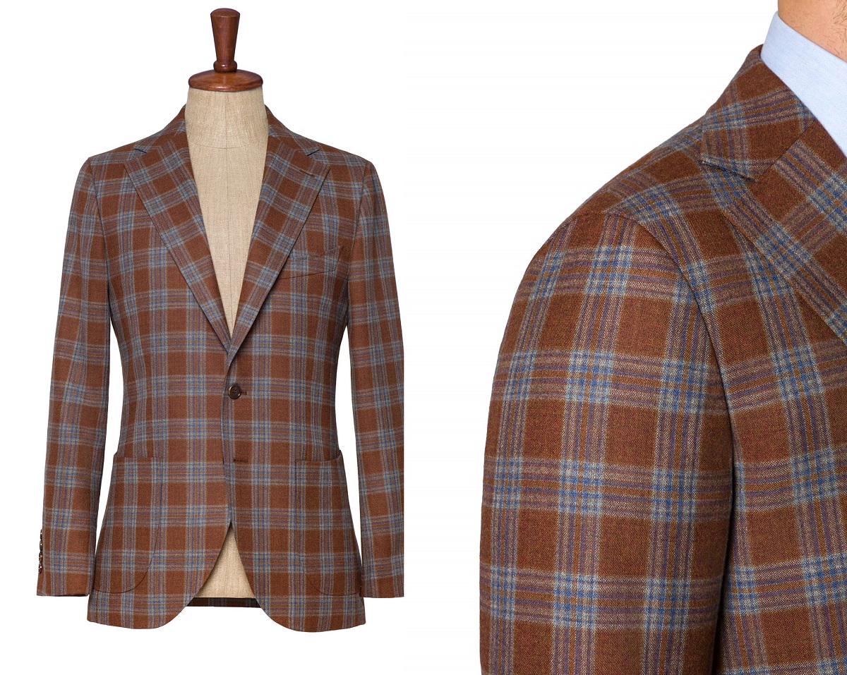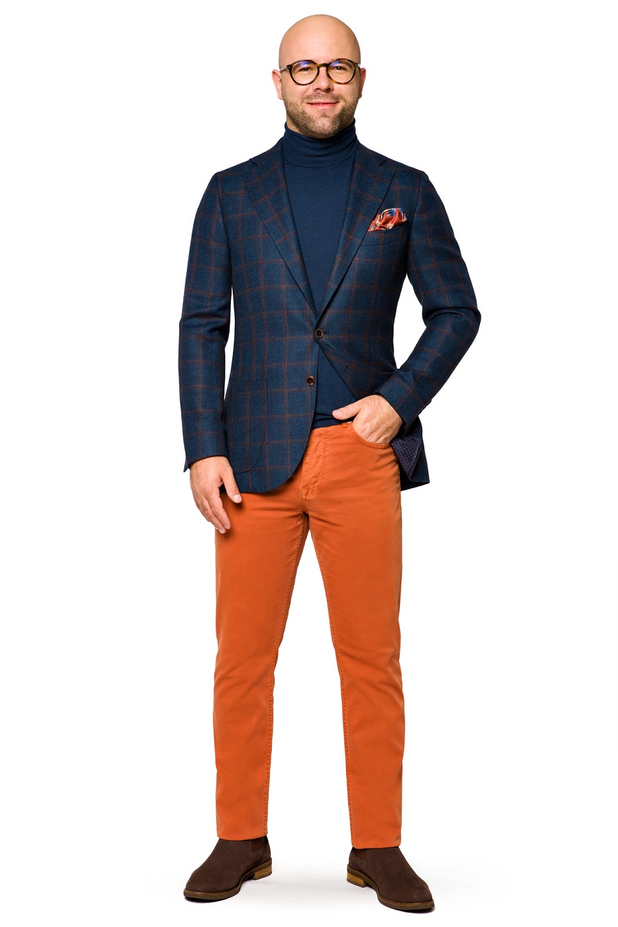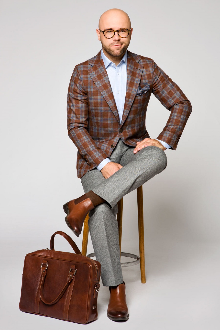 Poza ciemnymi brązami, mamy też marynarkę w jaśniejszych odcieniach. „Rudy lis” tak sobie roboczo nazwałem model Karlskrona, bo rzeczywiście na pierwszy plan wybija się tu jej rude tło, choć sama krata (w barwach szaro-niebieskich) też przyciąga uwagę. Ten model pojawi się w sprzedaży za kilka dni.