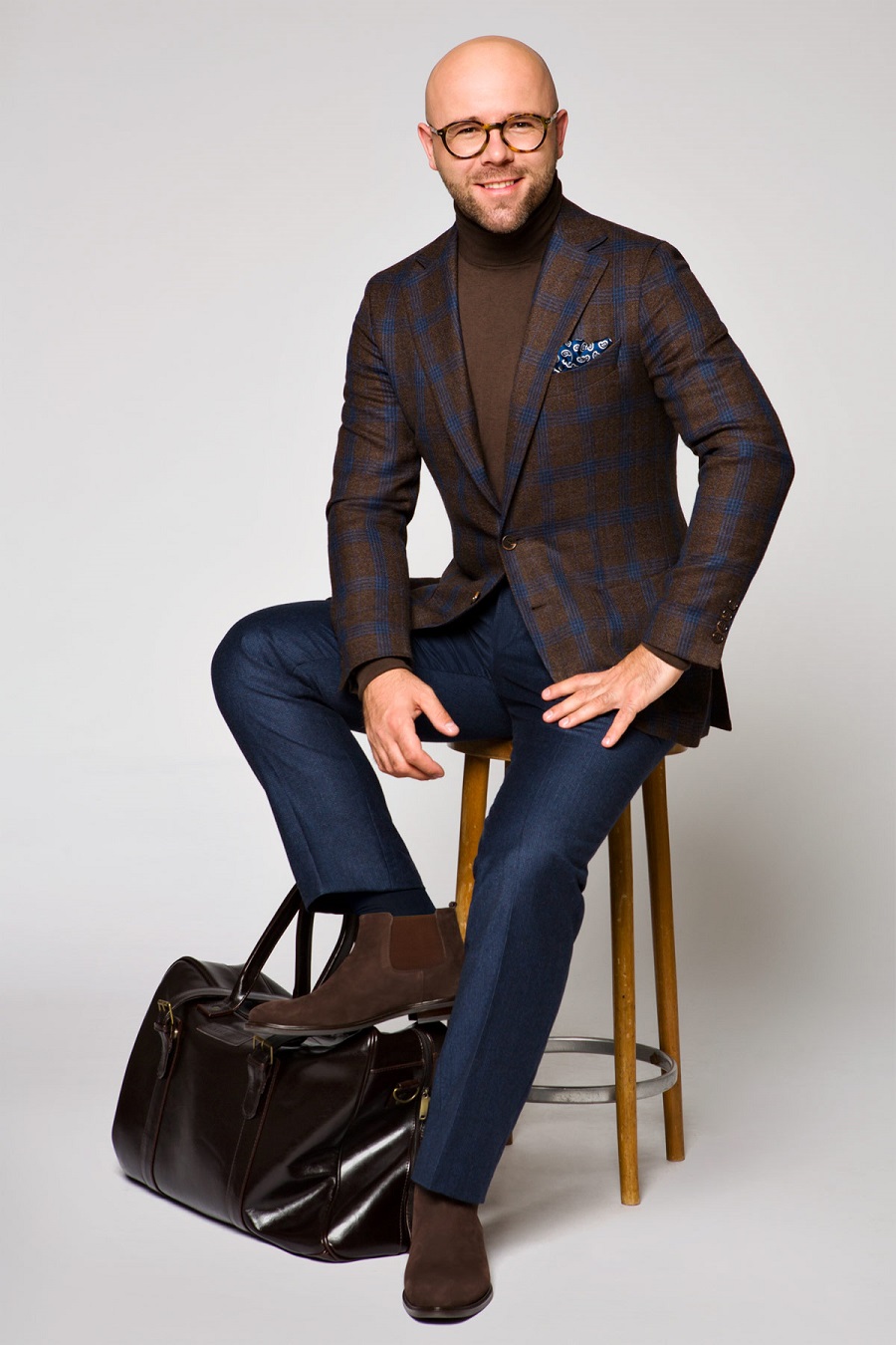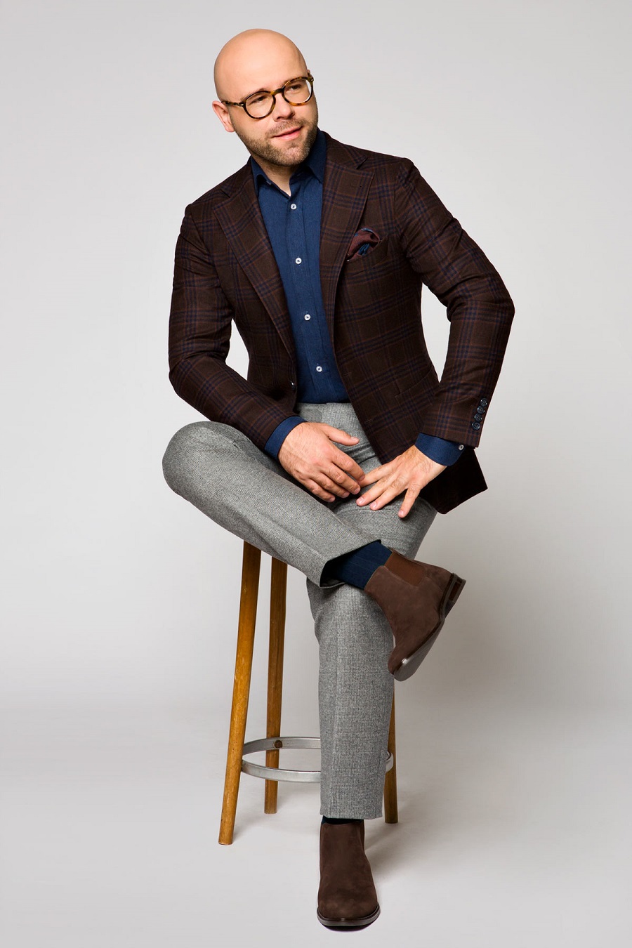 W tegorocznej kolekcji mamy sporo brązów i choć nie jest to jakiś super sprzedażowy kolor, to po raz kolejny próbujemy go wypromować w kraju, gdzie w marynarkach rządzi granat i niebieski :) Jeśli chodzi o brązy, to moim faworytem jest model Alta z leciutkiej flaneli. To marynarka w kolorze ciemnej czekolady i na to jest nałożona granatowa krata. Kapitalne połączenie i uwierzcie mi, zdjęcia tego nie oddają. Marynarka ta dobrze wygląda zarówno z dżinsami, jak i spodniami z flaneli (szare lub granatowe).