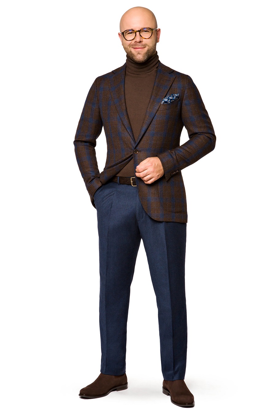 I na koniec jeszcze jeden ciemny brąz. Również z wyrazistą kratą. Ta marynarka świetnie wygląda z koszulami w odcieniach niebieskiego (również drobne prążki) i granatowymi spodniami (flanela, sztruks, dżinsy).