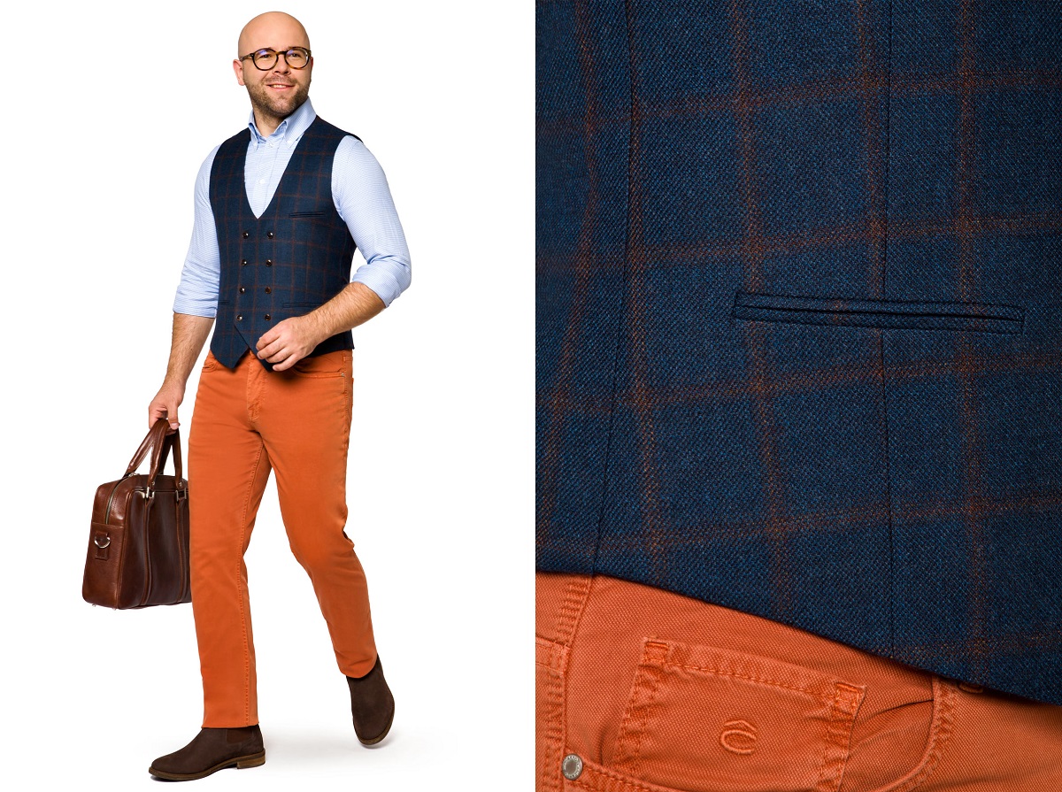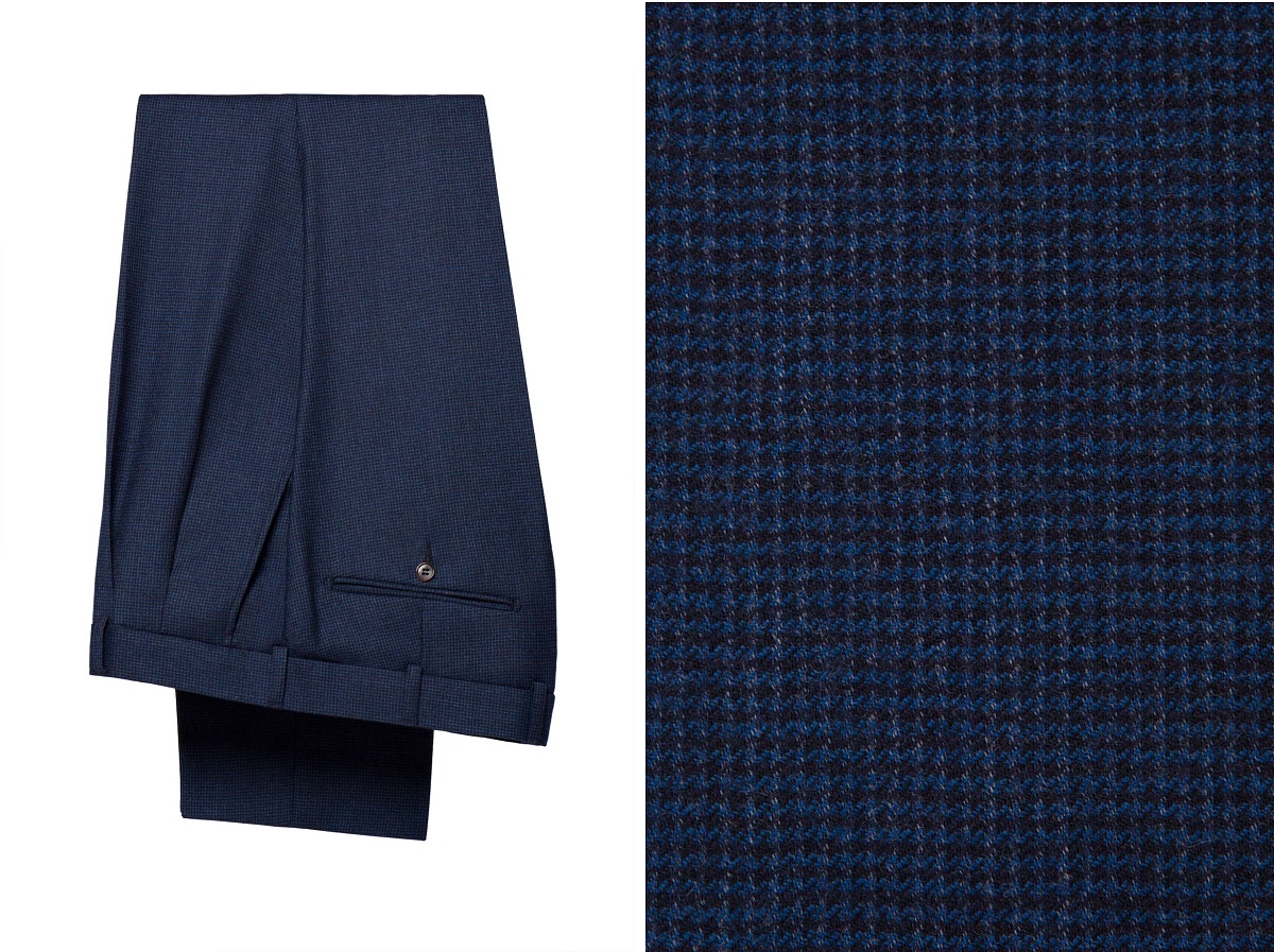 W poprzedniej kolekcji mieliśmy dwie gładkie tkaniny, a tym razem wybrałem wzorki, ale bardzo subtelne: drobną pepitkę oraz subtelną kratę księcia Walii. W dwóch modelach zastosowaliśmy jedną modyfikację w stosunku do ubiegłego roku – to podwójne zakładki, o które nasi klienci coraz częściej dopytywali. Nasze spodnie co prawda są szyte w fasonie slim, ale te podwójne zakładki powodują, że w górnej części są bardzo komfortowe i nie opinają ciała (ponadto mają stan wyższy o 2 cm w stosunku do spodni garniturowych Lancerto). I potwierdzam to ja – facet o szerokich udach, który zawsze ma z tym problem (lubię fason slim, ale luźniejszy na udach). Ważna informacja: spodnie z naszej kolekcji mają wykonany większy zapas materiału na dole, co pozwala na większe wydłużenie niż standardowo, a tym samym dopasowanie spodnie do osób o wyższym wzroście.