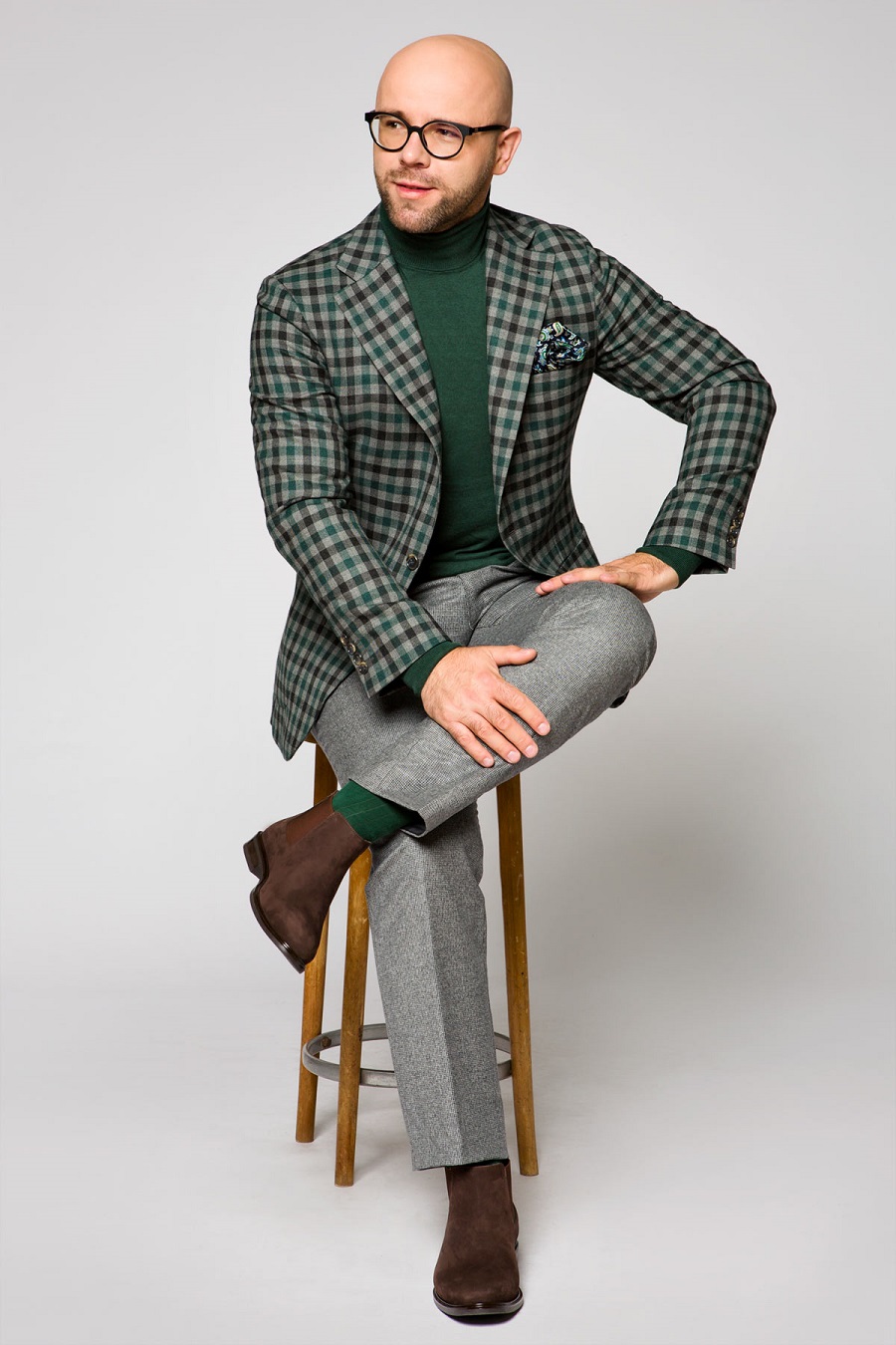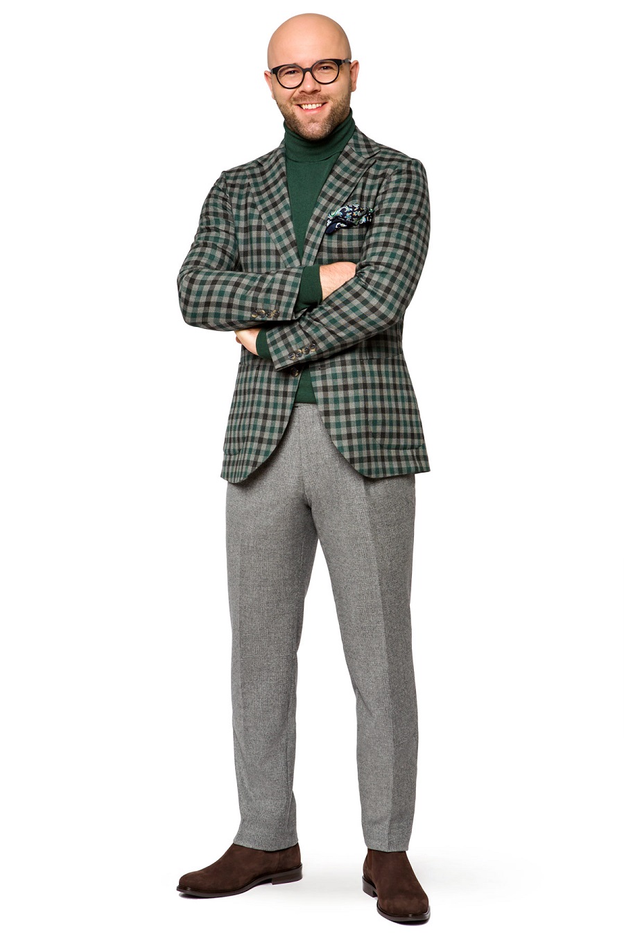 W zeszłym roku naszym bestsellerem była marynarka Finlandia w charakterystyczną kwadratową krateczkę gunclub, a moim zdaniem w tym sezonie ten wynik ma szansę powtórzyć model Nida. To również wzór gunclub, ale w trochę większej skali. Tło jest jasnoszare, a krata zielono-grafitowa. I właśnie ta zieleń butelkowa sugeruje dobór dodatków. Może to być golf w takim kolorze lub spodnie (np. sztruksy). To chyba będzie mój ulubiony model z nowej kolekcji. Przy okazji polecam wam też zielony golf ze zdjęć. To nowy model w ofercie Lancerto, który akurat idealnie pasuje do Nidy.