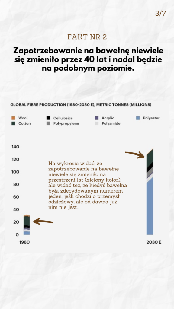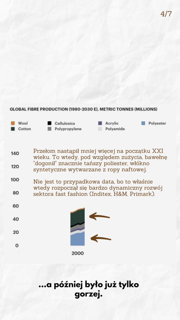 Drugi wniosek jest taki, że bawełna, która przez wiele dekad była surowcem numer jeden branży odzieżowej, straciła tę pozycję na rzecz poliestru, czyli włókna syntetycznego wytwarzanego z pochodnych ropy naftowej. Zwróćcie uwagę, że w latach 1980-2020 wykorzystanie bawełny niewiele się zmieniało, w przeciwieństwie do poliestru, którego produkcja bardzo dynamicznie rosła od końca lat 90. Nie jest to przypadkowa data, bo to właśnie wtedy rynek odzieżowy zaczęły przejmować tanie sieciówki, które potrzebowały zamienników bawełny, wełny, lnu.